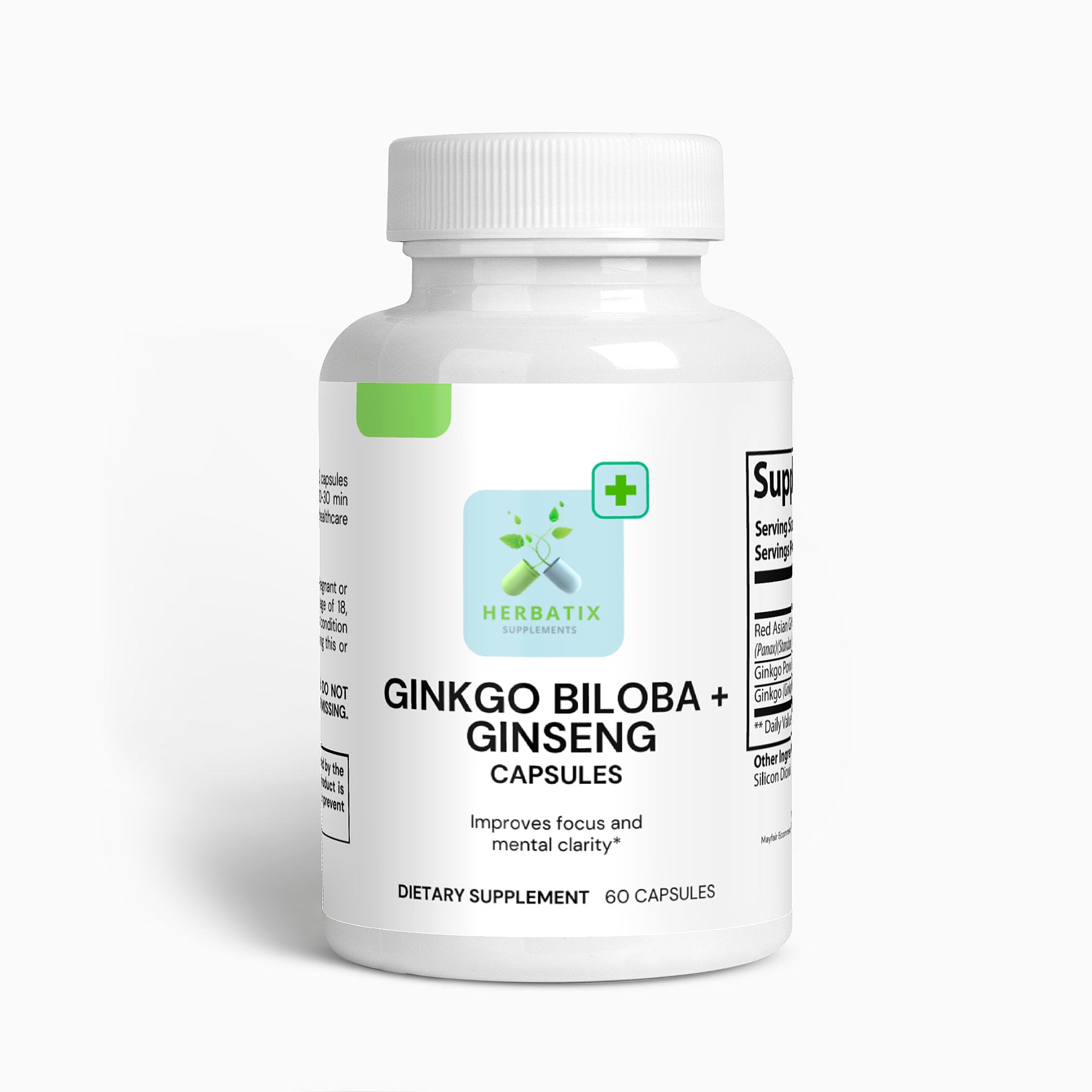Ingredients: Red Asian Ginseng Extract (Standardized to 7% Ginsenosides)(stem)(leaf), Ginkgo Biloba Leaf Powder, Ginkgo Biloba Leaf 24% Flavones, Hypromellose (vegetable capsule), Silicon Dioxide.